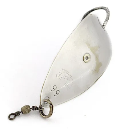 In het metaal aan de achterzijde zijn de 'Miller 66'-identificatie en de herkomst uit de VS ingestanst. De verzilverde afwerking reflecteert het licht over de gehele lengte van 5,5 cm van deze in Amerika gemaakte lepel, die een veelzijdig gewicht van 7 g heeft. Dit exemplaar, een zeldzaamheid in de wereld van vintage hengelsportmateriaal, is voorzien van een grote enkele haak die stevig door het blad is bevestigd. De conditie is een goed bewaarde 4/5, met slechts minimale oppervlakkige ouderdomssporen en behoud van een heldere, reflecterende glans. De montage bestaat uit een stevige splitring aan de voorzijde bevestigd aan een originele barrel wartel, ontworpen voor werpen of trollen. Dit kunstaas, met productcode 22949, kenmerkt zich door de centrale klinknagelconstructie die kenmerkend was voor het duurzame ontwerp van Miller. Het metaal van de haak is in de loop der tijd iets donkerder geworden, wat een duidelijk visueel contrast vormt met het gepolijste blad.