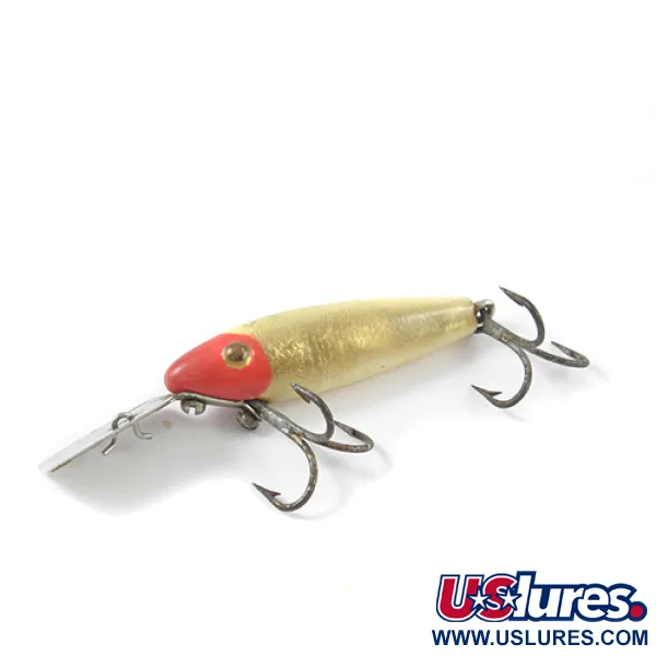De metalen duiklip is duidelijk gemerkt met «L&S 1M SINKER», wat dit specifieke zinkende model identificeert dat is geproduceerd door de L&S Bait Company in de VS. Met een lengte van slechts 4 cm (1 1/2") en een gewicht van 2,5 g (3/32 oz), maakt het compacte formaat dit een gespecialiseerd hulpmiddel voor het vissen op snoek of snoekbaars. Het kleurenschema combineert een felle rode kop met een glanzende goud-witte body, een variatie op de contrastrijke patronen die de MirrOlure-serie tot een favoriet maakten voor sportvissers in het midden van de vorige eeuw. Het ontwerp is voorzien van twee dreginhaken op de buik en een vaste metalen duiklip die tevens dienst doet als bevestigingsoog. Met een conditiescore van 4/5 vertoont dit exemplaar zeer lichte gebruikssporen, waarbij de afwerking en de markeringen op het metaal perfect bewaard zijn gebleven. Code 2748 vertegenwoordigt de designevolutie van L&S kunstaas, dat geprezen werd om de duurzame constructie en kenmerkende interne reflectie.