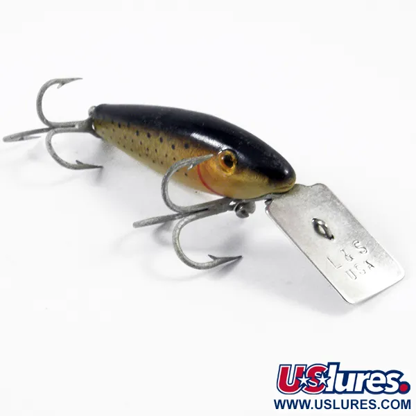 Dit kleine zinkende kunstaas, gemerkt met 'L&S USA' op de kenmerkende vierkante metalen lip, vertegenwoordigt een klassiek tijdperk van Amerikaans hengelsportontwerp van de L&S Bait Company. Met een lengte van 4 cm (1 1/2") en een gewicht van 2,5 g (3/32 oz), heeft de MirrOlure een foreluitvoering met een donkere antracietkleurige rug die overgaat in goudgele flanken. Fijne zwarte stippen bedekken de zijkanten, aangevuld met een enkele rode gebogen lijn achter het oog om een kieuw te simuleren. Dit exemplaar verkeert in 5/5 conditie, waarbij de lak en het beslag uitstekend bewaard zijn gebleven. De constructie maakt gebruik van een tweekleurige schroefbevestiging voor de duikplaat, wat zorgt voor de nodige ballast voor zinkend kunstaas bedoeld voor snoek of snoekbaars. Het beslag bestaat uit twee dregjes met een matte afwerking, wat het utilitaire ontwerp weerspiegelt dat gebruikelijk was in de Amerikaanse productie van het midden van de 20e eeuw.
