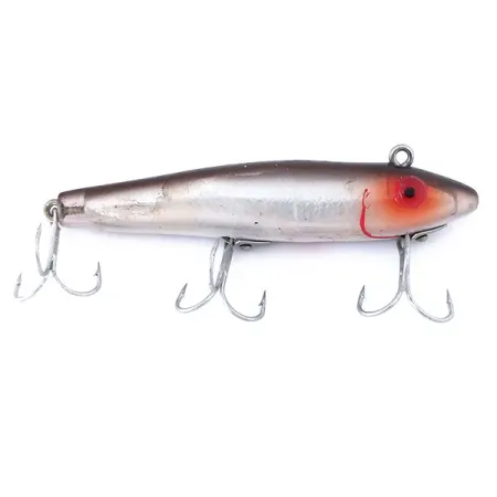 Een gewicht van 1/2 oz (14 g) geeft deze L&S Bait MirrOlure 52M 27 Original de nodige dichtheid voor een zinkende twitchbait die is ontworpen om diepere waterlagen te bereiken. Geïdentificeerd door productcode 10997, beschikt het kunstaas over het M27 kleurprofiel, bestaande uit een zilverkleurig geschubd lichaam, een donkere rug en een opvallende rode kop met een donkere pupil. Met een lengte van 3 3/4 inch (9,5 cm) vertrouwt de montage op drie zilverkleurige dreggen die zijn vastgezet met stevige schroef-en-plaat bevestigingen die typisch zijn voor de Amerikaanse productie uit het midden van de eeuw. De buik is gemarkeerd met een duidelijke rode '52M27' stempel, die scherp afsteekt tegen de bleke onderkant. Dit exemplaar verkeert in 4/5 conditie en vertoont zeer lichte ouderdomssporen terwijl de gladde, schone afwerking op het kunststof lichaam behouden is gebleven. Ontwikkeld voor zowel werpen als trollen, was het oorspronkelijk gebouwd om de agressieve aanbeten van zalm, snoek en glasnoogbaars te weerstaan. Het lijnoog bevindt zich bovenop de kop om de zinkende oriëntatie tijdens het binnenvissen te bevorderen.