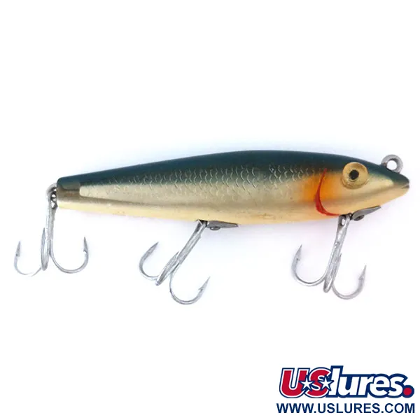 Zijkanten met schubbenpatroon in een rijke gouden afwerking bepalen de esthetiek van deze L&S Bait Mirrolure 7M24, een klassieke oppervlakte-walker uit de VS. Met een lengte van 11 cm (4 1/4") en een gewicht van 11 g (2/5 oz) heeft dit specifieke model een diep blauwgroene rug die overgaat in getextureerde metallic zijkanten, geaccentueerd door een helderrode kieuwmarkering bij de kop. De grote, opvallende gele ogen zijn vlak onder het bovenop gemonteerde bevestigingsoog geplaatst, een kenmerkend ontwerp voor de 7M-serie bedoeld voor oppervlaktepresentatie op 0 m. Uitgerust met drie scherpe dregjes, blijft het beslag glanzend en functioneel. Dit exemplaar, met productcode 10990, verkeert in uitstekende staat van bewaring met een score van 5/5. Verzamelaars zullen het M24-kleurenpatroon waarderen, een standaard voor het vissen op baars, snoek en forel via werpen of trollen. Het slanke, sigaarvormige profiel is ontworpen om hoog in de waterkolom te blijven.