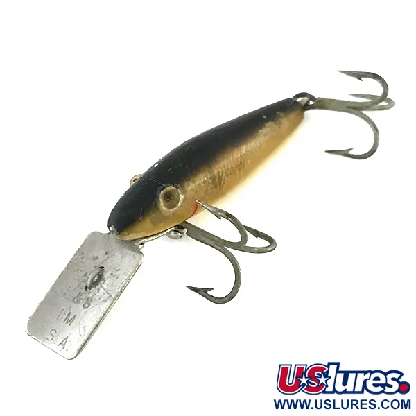 Vervaardigd in de VS, dit minuscule zinkende kunstaas weegt slechts 3/32 oz (2,5 g). Dit specifieke MirrOlure exemplaar, met productcode 8501, meet een compacte 1 1/2" (4 cm) en is voorzien van een klassieke Gold afwerking met een donkere rug en subtiele rode accenten bij de kieuwen. De hardware bestaat uit twee originele dreggen die zijn bevestigd via een buikschroef en een achterste oogje. Een opvallend kenmerk van deze constructie is de rechthoekige metalen duiklip, die is gestempeld met de keurmerken van de fabrikant. Het lichaam toont zijn ouderdom door een lichte verzachting van de lak, wat het een conditiescore van 5/5 oplevert. Ontworpen door de L&S Bait Company voor zinkende toepassingen, zoeken verzamelaars vaak naar deze kleinere varianten bedoeld voor soorten zoals snoek of snoekbaars. De geschilderde ogen blijven duidelijk afsteken tegen de goudkleurige flanken.