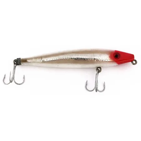 Dit in de VS gemaakte oppervlakte-aas weegt precies 1/2 oz (14 g) en is een klassiek voorbeeld van het vakmanschap van L&S Bait Mirro lure. De MirrOlure Top Dog, met productcode 10219, is 4 1/4" (10,5 cm) lang en heeft een drijvend ontwerp dat specifiek bedoeld is voor topwater-visserij. Dit exemplaar heeft een opvallende rode kop die overgaat in een parelmoer zilveren lichaam, een kleurencombinatie met hoge zichtbaarheid die geliefd is bij vissers die op snoek en grote baars jagen. De hardware bestaat uit twee robuuste dregnhaken — één op de buik en één aan de staart — bevestigd met duurzame metalen hangers. Een eenvoudig zwart oog is in het rode kopgedeelte geplaatst, wat een duidelijk focuspunt vormt. Dit specifieke kunstaas verkeert in uitstekende staat, met een zeer goed bewaarde afwerking die een conditiescore van 5/5 rechtvaardigt. Een uitlopende metalen kraag is aanwezig bij de achterste haakbevestiging, een specifiek detail van de montage van deze drijvende walker.