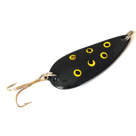 Met een gewicht van 11 g (2/5 oz) heeft deze Moriyama lepel de juiste dichtheid om tijdens de worp diepere doelen te bereiken. Dit kunstaas uit Japan is afgewerkt in een contrastrijk patroon genaamd Frog, met een egaal zwarte bovenkant versierd met vijf duidelijke gele cirkels. Het druppelvormige metalen lichaam van 5 cm (2") heeft een achterkant van gepolijst nikkel voor een sterke metaalglans. Dit specifieke exemplaar met productcode 0902 verkeert in een staat van 4/5 en vertoont slechts lichte gebruikssporen die passen bij de vintage status. De lepel is uitgerust met een bronzen dreg bevestigd via een splitring, met een extra ring aan de neus voor een stevige bevestiging van de lijn.