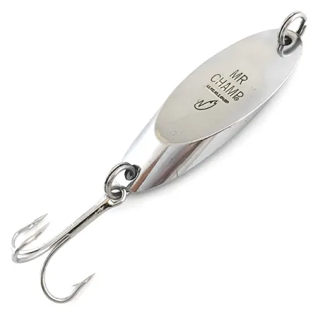 Duidelijk in het gepolijste oppervlak gestempeld, identificeert het 'MR CHAMP'-merk deze klassieke Amerikaanse pilker van Weber. Met een gewicht van 3/4oz (21g) heeft het zware metalen lichaam een schitterende nikkelafwerking die het licht reflecteert over de aerodynamische vorm. Dit exemplaar is 2 1/4" (6 cm) lang, draagt productcode 5235 en stamt uit de periode voordat de lijn werd overgenomen door Luhr Jensen. De voorkant is voorzien van het iconische springende vis-logo en de tekst 'MR CHAMP', terwijl de achterkant een glad, spiegelend oppervlak is. Een stevige splitring verbindt een scherpe dreg met de staart, klaar voor verticaal vissen of verre worpen. Dit kunstaas verkeert in 5/5 conditie en toont de hoogwaardige verzinking waar Weber bekend om stond tijdens hun honderdjarige geschiedenis op de Noord-Amerikaanse markt. Het bovenste oog is uitgerust met een zware ring voor een veilige lijnbevestiging.
