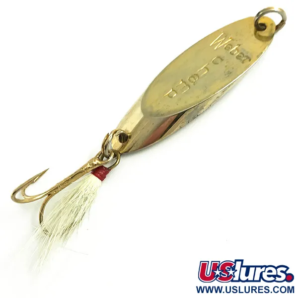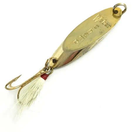 De naam Weber, duidelijk gestanst in de gepolijste metalen body van 14g (1/2oz), identificeert deze MrChamp als een deel van het Amerikaanse hengelsporterfgoed van een bedrijf met een honderdjarige geschiedenis in de USA en Canada. Dit gouden exemplaar van 5cm (2"), met productcode 6068, vertegenwoordigt het ontwerp voordat het merk werd opgenomen in het assortiment van Luhr Jensen. De staat is opmerkelijk schoon, met een 5/5 score voor de behouden glans. De achterzijde is voorzien van een gevederde dreg met witte haren, vastgezet met een traditionele rode wikkeling. Een sterke splitring aan de neus biedt een solide bevestigingspunt voor werpen of jiggen.
