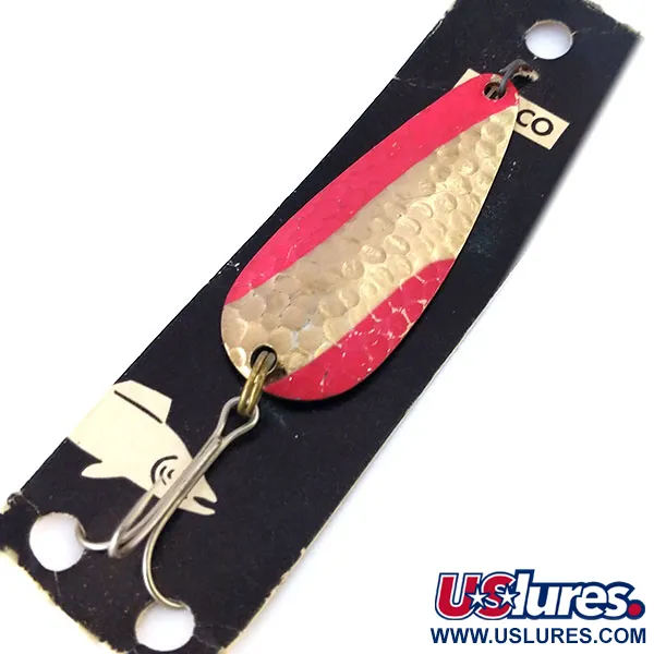 Gehamerde gouden textuur vormt het hart van deze vintage lepel, omringd door secties felroze verf. Met een afmeting van 5,5 cm (2 1/4") en een gewicht van 10 g (1/3 oz) is de Nebco FlashBait 266 een klassiek Amerikaans kunstaas. Onder ultraviolet licht vertonen de roze strepen een duidelijke gloed, een technisch detail dat is ontworpen om de zichtbaarheid in diep of troebel water te vergroten. Dit specifieke exemplaar, herkenbaar aan productcode 10798, is ongebruikt en zit nog op de originele zwarte kartonnen verpakking. De hardware bestaat uit een dreg die met een lange draadclip aan de staart is bevestigd.