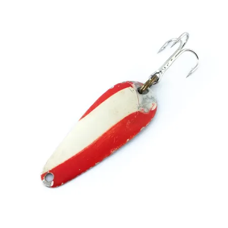 Rode en witte diagonale strepen over een vernikkeld druppelvormig lichaam bepalen het visuele karakter van deze vintage Nebco FlashBait 366. Met een gewicht van slechts 1,9 g (1/16 oz) en een lengte van 3,3 cm (1 1/4"), vertegenwoordigt hij de delicate kant van de Amerikaanse hengelsportgeschiedenis uit het midden van de eeuw. Het omdraaien van de lepel onthult de authentieke stempel van de maker Nebco in het metaal, wat de oorsprong uit de Verenigde Staten bevestigt. Dit item, gecatalogiseerd onder productcode 11092, heeft een conditiescore van 4/5 en vertoont een goed onderhouden afwerking die nog steeds glanst. De hardware bestaat uit een klassieke splitring en een scherpe dreg, waardoor het originele profiel van het kunstaas behouden blijft. De verflaag vertoont de typische gelaagde textuur van dat tijdperk, die contrasteert met de gepolijste nikkelen achterkant.