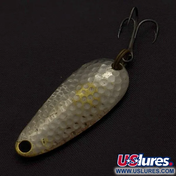 Met een lengte van exact 4 cm en een druppelvormig profiel onderstreept de Nebco Tor-P-Do 1 het klassieke Amerikaanse vakmanschap. Dit kunstaas (artikelcode: 24173) weegt 9 gram en is voorzien van een gehamerde nikkelen afwerking over een messing body, waarbij het onderliggende metaal op kleine, authentieke plekken zichtbaar is. Dit specifieke zeldzame exemplaar verkeert in een conditie van 4 op 5 en ziet er schoon en goed onderhouden uit. Het diep gehamerde oppervlak is ontworpen om tijdens het binnenvissen licht onder verschillende hoeken te reflecteren, en de montage omvat een robuuste dreg die met een splitring is bevestigd. Ontworpen voor het werpend vissen in zoet water; de neus is voorzien van een eenvoudig boorgat voor de bevestiging van de vislijn.