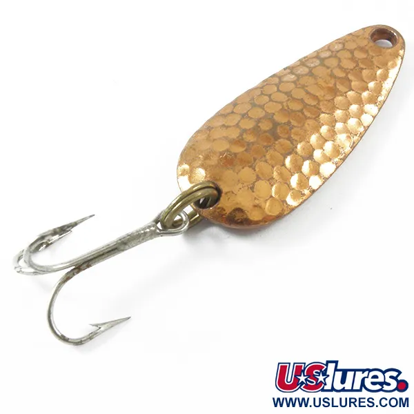 Een gehamerde koperen afwerking definieert de voorkant van deze vintage lepel, ontworpen om lichtreflectie vanuit verschillende hoeken te maximaliseren. Met een gewicht van 7 g (1/4 oz) en een lengte van 4 cm (1 1/2") heeft de Nebco Tor-P-Do 1 een klassiek druppelprofiel dat kenmerkend was voor de Amerikaanse hengelsportproductie in het midden van de vorige eeuw. De achterkant van het kunstaas is glad koper, duidelijk gestempeld met „NEBCO”, „TOR-P-DO-1” en de herkomst „MPLS. MINN.”, wat de geschiedenis bij de in Minneapolis gevestigde maker bevestigt. Het beslag bestaat uit een duurzame splitring en een scherpe dreg, waarbij het geheel lichte tekenen van ouderdom vertoont die een conditie van 4/5 rechtvaardigen. Geregistreerd onder productcode 3296, blijft het bevestigingsoog aan de kop perfect rond en vrij van structurele slijtage, waardoor het een solide vertegenwoordiger is van Amerikaans werpmateriaal.