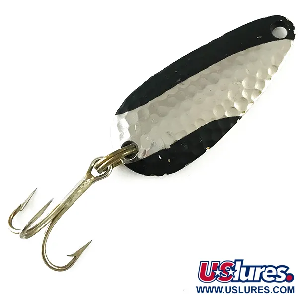 Gehamerde nikkeltexturen gecombineerd met krachtige zwarte accenten bepalen het opvallende visuele profiel van deze vintage lepel. Met een afmeting van 1 1/2" (4 cm) en een gewicht van 1/4 oz (7 g), draagt dit exemplaar de duidelijke "NEBCO" TOR-P-DO-1 stempel samen met zijn herkomst uit Ripley, Miss. op de gepolijste achterzijde. De voorkant heeft een gehamerde afwerking die ontworpen is om licht te vangen en te reflecteren, omlijst door diepzwarte verf op de uiteinden. Geregistreerd onder productcode 6235, is het kunstaas voorzien van een klassieke dreg die is bevestigd met een stevige splitring. De vervaardiging uit massief metaal is typerend voor de Amerikaanse productie uit het midden van de eeuw uit de VS. De staat is uitstekend, met een goed bewaarde afwerking en scherpe stempels, wat een score van 5/5 oplevert. Het oogje voor de lijn is zuiver en nauwkeurig geboord aan het smalle uiteinde van de druppelvorm.