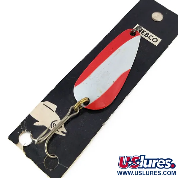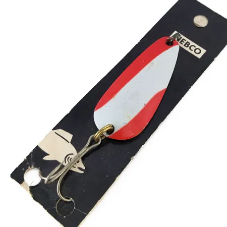 Met een lengte van 5 cm (2 inch) heeft deze lepel een opvallend rood-wit diagonaal patroon over de vernikkelde body. De Nebco Tor-P-Do 2, geregistreerd onder productcode 10684, is een klassiek ontwerp uit het midden van de vorige eeuw, met een druppelvormig profiel bedoeld voor werpen of trollen. De achterzijde van het metaal is gestempeld met de naam Nebco en de modelnaam, waarbij de originele metaalglans behouden is gebleven. Een extra sterke dreg is aan de onderkant bevestigd met een messingkleurige splitring. Dit exemplaar is ongebruikt en zit nog op de originele zwarte presentatiekaart, voorzien van de iconische illustratie van een springende vis en het merklogo. Met een gewicht van 14 g (1/2 oz) voelt de lepel substantieel aan voor zijn compacte formaat, compleet met een bevestigingsoog aan de smalle zijde.