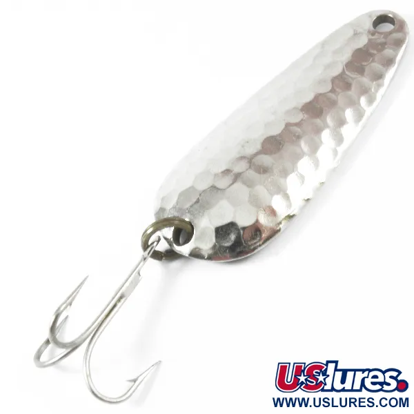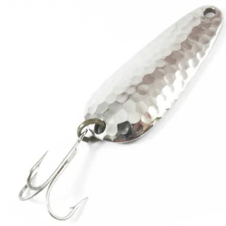In de gladde nikkelen achterkant van deze 5 cm (2") lepel zijn de herkomstgegevens duidelijk gestanst: "NEBCO TOR-P-DO 2 MPLS. MINN.", een directe link naar de fabricagegeschiedenis van het merk in Minneapolis. Dit kunstaas van 14 g (1/2 oz) heeft een opvallende gehamerde nikkelafwerking op de bolle zijde, ontworpen om tijdens het binnenvissen licht uit meerdere hoeken te vangen en te reflecteren. De hardware op dit exemplaar, gecatalogiseerd onder productcode 3585, bevat een robuuste dreg bevestigd via een stevige splitring, beide in uitstekende staat. Gezien de conditiescore van 5/5 blijven de metalen oppervlakken glanzend en vrij van noemenswaardige slijtage of krassen. De druppelvorm en gewichtsverdeling maken het een veelzijdig hulpmiddel voor zowel werpen als verticaal vissen, een toonbeeld van Amerikaans hengelsportontwerp uit het midden van de vorige eeuw. Een nauwkeurig gesneden oog aan de smalle kant voltooit de eenvoudige, effectieve geometrie van dit in de VS gemaakte kunstaas.