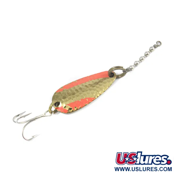 Diagonale rode strepen lopen over het gehamerde gouden oppervlak van deze 4 cm (1 1/2") lepel, wat zorgt voor een duidelijk visueel contrast. Met een gewicht van 7 g (1/4 oz) heeft dit exemplaar een diep gehamerde textuur aan de voorzijde om lichtreflectie te maximaliseren. Aan de achterkant van het kunstaas is een gladde, gepolijste gouden zijde te zien, duidelijk gestempeld met de merktekens van de fabrikant: "Nebco", "TOR-P-DO-1" en "MADE IN USA". Het beslag is intact en bestaat uit een splitring verbonden met een kettingwartel, ontworpen om kinken in de lijn te voorkomen tijdens het werpen of trollen. Met een score van 4/5 vertoont het kunstaas lichte gebruikssporen terwijl de structurele integriteit en levendige afwerking behouden zijn gebleven. Een scherpe dreg is aan de staart bevestigd via een splitring, wat dit klassieke Amerikaanse kunstaas onder productcode 2082 compleet maakt.