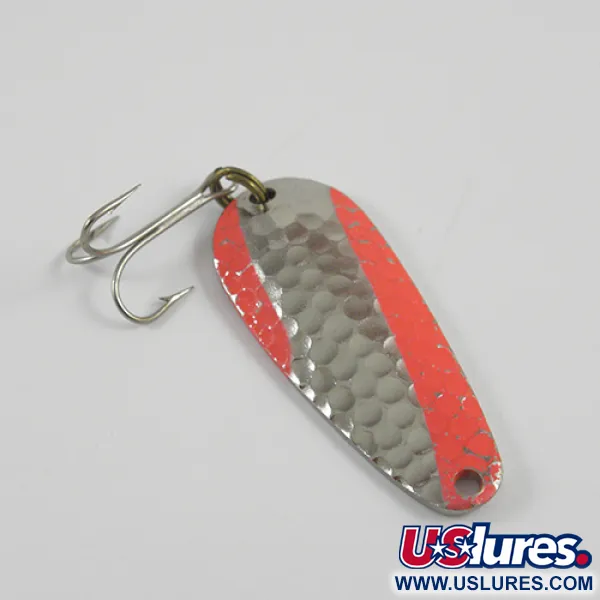 Duidelijk gestempeld in de gladde achterzijde van het metaal staat 'NEBCO TOR-P-DO MPLS. MINN', wat de oorsprong markeert in het hart van de visserijsector van Minnesota uit het midden van de vorige eeuw. Een klassieke gehamerde nikkelafwerking bedekt de voorzijde, omzoomd door een levendig oranje kleurenschema dat het licht vangt. Met een gewicht van 1/2 oz (14 g) en een lengte van 2" (5 cm) behoudt het metalen lichaam zijn originele glans, wat een conditiescore van 5/5 oplevert voor de goed bewaarde oppervlakken. Onder productcode 2784 is deze lepel voorzien van een stevige dreg, bevestigd met een splitring aan de staart. De druppelvorm is een vaste waarde voor sportvissers die zich richten op verschillende zoetwatersoorten via werp- of sleeptrillingen.