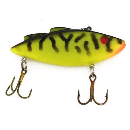 Lichtgevende eigenschappen bepalen het speciale karakter van deze lipless crankbait, die fel reageert onder UV-licht. Met een gewicht van 1/2 oz (14 g) en een lengte van 3" (7,5 cm) is dit exemplaar de Norman N-Ticer UV, herkenbaar aan productcode 9718. De buitenkant verkeert in 5/5 staat en toont het Fire Tiger-patroon in zijn originele, levendige staat met scherpe verticale zwarte balken over een fluorescerend geelgroen lichaam en een opvallend rood oog. Twee stevige dreggen zijn via splitringen aan de buik en staart gemonteerd, typerend voor hoogwaardig in de VS gemaakt materiaal uit die tijd. Als zinkende lipless crankbait, of „rattlin”, maakt hij het mogelijk om op variabele diepte te vissen afhankelijk van de inhaalsnelheid, wat hem veelzijdig maakt voor zowel werpen als trollen. Sportvissers grijpen vaak naar dit type luidruchtig kunstaas bij het vissen op rovers zoals snoek, baars of forel in dieper water of bij weinig licht waar de glow-functie tot zijn recht komt. De reputatie van Norman voor het produceren van betrouwbaar kunstaas is duidelijk zichtbaar in de strakke lijnen en solide constructie van dit N-Ticer model.