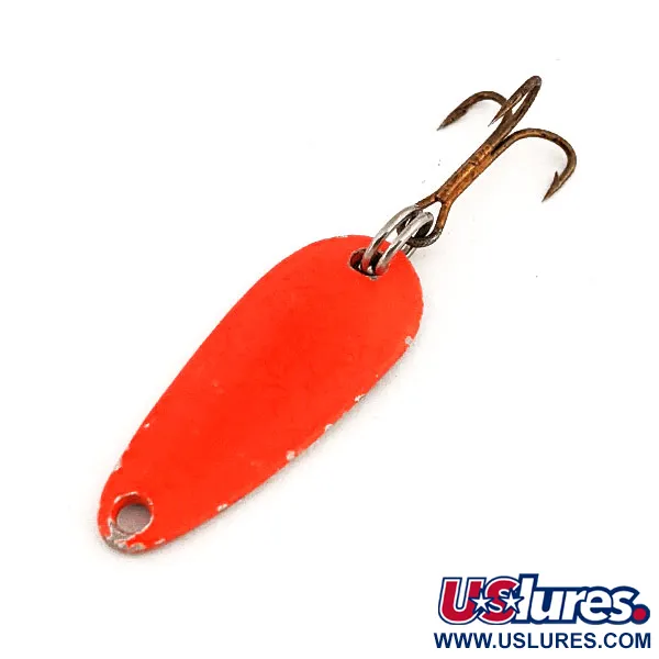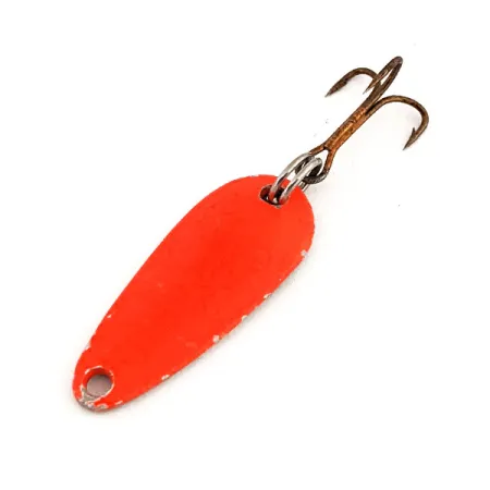 Met een lengte van exact 3 cm (1 1/4") biedt deze vintage lepel een kenmerkend druppelvormig profiel, ontworpen voor het vissen met licht materiaal. Dit exemplaar heeft een hoogzichtbare oranje afwerking op de voorzijde die, zoals de naam Otto's Ace UV al aangeeft, fel oplicht bij blootstelling aan ultraviolet licht. Met een gewicht van 3g (3/32oz) is de lure herkenbaar aan productcode 12763 en geproduceerd in de USA. Een zilverkleurige achterzijde vormt een aanvulling op de feloranje voorzijde, terwijl de hardware bestaat uit een enkele splitring en een dreg. Beoordeeld met een conditie van 5/5, vertoont het kunstaas lichte slijtage aan de verfranden en een donkere verkleuring op het metaal van de haak.