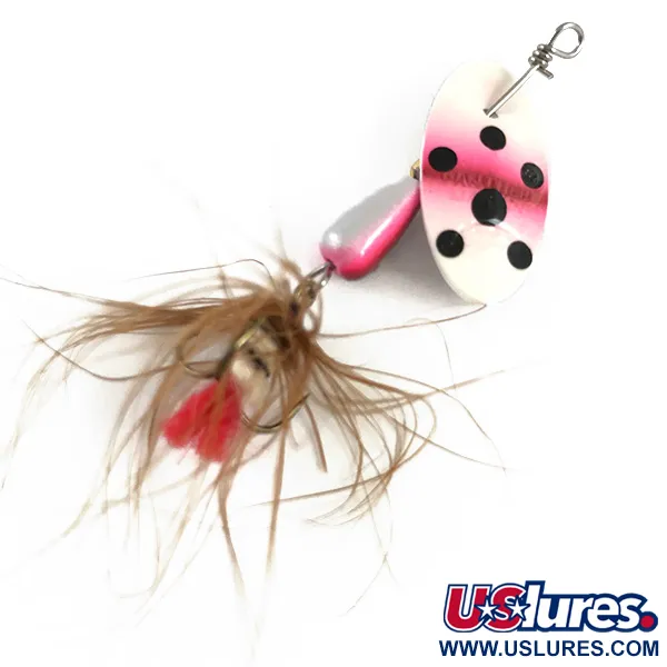 Zwarte stippen op een wit-roze kleurverloop maken deze 3,5 cm (1 1/2") spinner een opvallende keuze voor elke light-tackle visser. Dit specifieke Panther Martin 1 model, productcode 4374, weegt 2 g (1/16 oz) en toont het traditionele Italiaanse vakmanschap van het merk. Het druppelvormige lichaam is verdeeld in een zilveren bovenkant en een roze buik, eindigend in een gedraaide dreg met bruine veren en een rode wollen bijtpunt. Omdat de conditie 6 is, is het kunstaas ongebruikt, precies zoals het de fabriek in Italië verliet. Het ontwerp met het blad direct op de as is het kenmerk van de fabrikant, bedoeld om het blad onmiddellijk te laten draaien bij contact met het water. Een goudkleurige kraal scheidt het verzwaarde lichaam van de haak, wat zorgt voor een soepele rotatie en een juiste balans. Voor wie bekend is met de Trout-kleurenserie, biedt de combinatie van gestippelde patronen en natuurlijke veren een zeer gedetailleerde presentatie in een klein pakket.