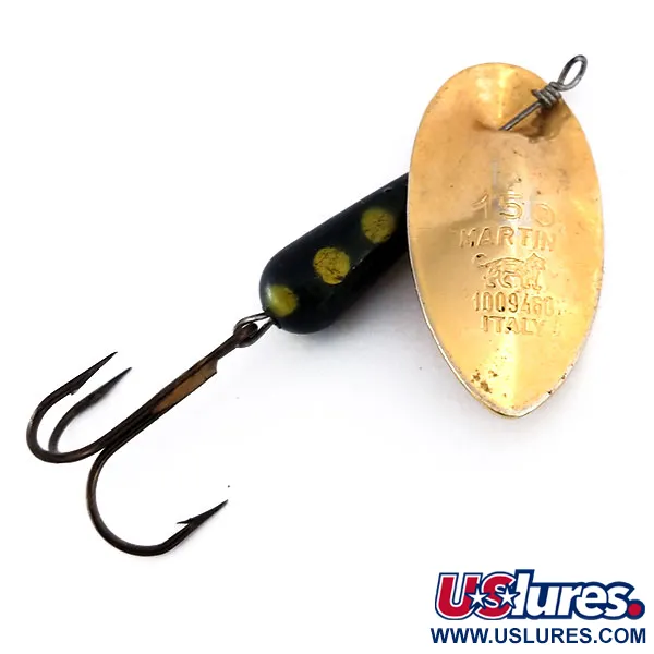 Het klassieke Panther Martin leeuwenlogo is direct in het goudkleurige blad gestampt, samen met 'Italy' en het nummer 15. Met een gewicht van 1/2oz (15g) draagt deze spinner productcode 10134 en toont het de kenmerkende inline bladmontage waarbij de as direct door het metaal gaat. Het verzwaarde lichaam is druppelvormig, afgewerkt in zwart met drie felgele stippen voor contrast. Met een lengte van 2 3/4" (7cm) is het kunstaas in 5/5 conditie bewaard gebleven en heeft het nog de originele bronzen dreg. Het goudkleurige blad is ook voorzien van de numerieke stempel 1009460, een kenmerk van deze oudere Italiaanse exemplaren.