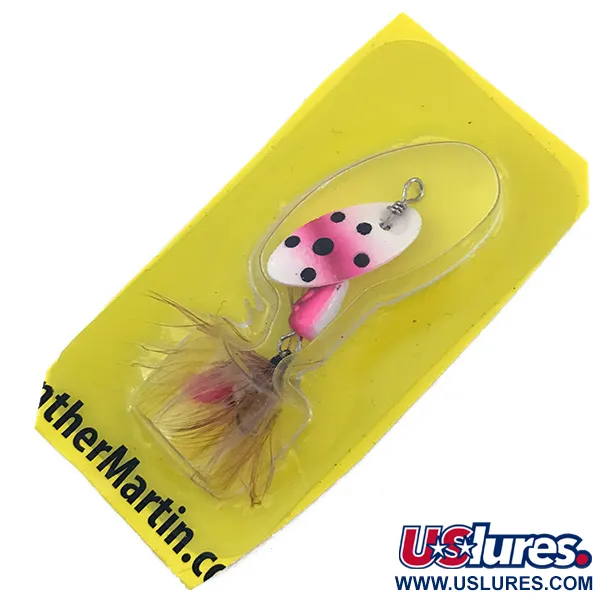 Deze spinner weegt 3/32oz (2,5g) en heeft een opvallend forelpatroon met een witte basis, felle roze randen en duidelijke zwarte stippen. Het blad is rechtstreeks op de as gemonteerd, een kenmerkend Panther Martin-ontwerp zonder de traditionele beugel om een hogere rotatiesnelheid te bereiken. Het kunstaas is 2" (5cm) lang en uitgerust met een dreg die is voorzien van gele en lichtbruine veren. Dit exemplaar, met productcode 4992, zit nog in de originele gele blisterverpakking en is in ongebruikte staat. Het druppelvormige lichaam is verzwaard voor werpprecisie, en de verpakking vermeldt de herkomst uit de Dominicaanse Republiek voor Harrison-Hoge Industries. Op de achterkant staan het historische adres van de fabrikant in Port Jefferson, NY, en de standaard technische waarschuwingen.