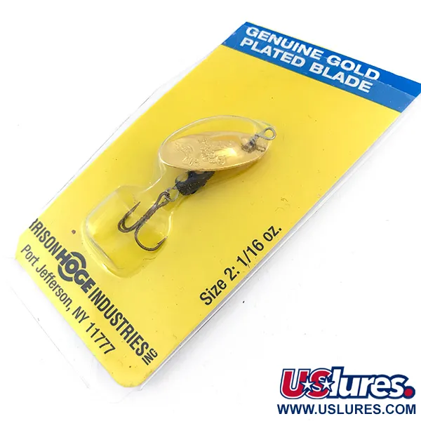 Een echt verguld blad definieert deze spinner in maat 2, wat zorgt voor een duidelijke schittering bedoeld voor lichte visserij. Met een gewicht van 1/16 oz (1,77 g) en een lengte van 2" (5 cm), draagt dit exemplaar productcode 4994 en stamt het uit de productieperiode van Harrison Hoge Industries. Het blad is direct op de centrale as gemonteerd, een technisch kenmerk dat is ontworpen om onmiddellijke rotatie bij het binnenhalen mogelijk te maken. Deze uitvoering is gecombineerd met een verzwaard zwart druppelvormig lichaam en een scherpe dreg voor betrouwbare prestaties. De kunstvisser is gehuisvest in de originele geel-blauwe verpakking uit Port Jefferson, NY, is ongebruikt en verkeert in uitstekende staat. De achterkant van de kaart vermeldt het convex/concaaf bladvorm en bevat de nodige veiligheidswaarschuwingen betreffende de extreem scherpe haken.