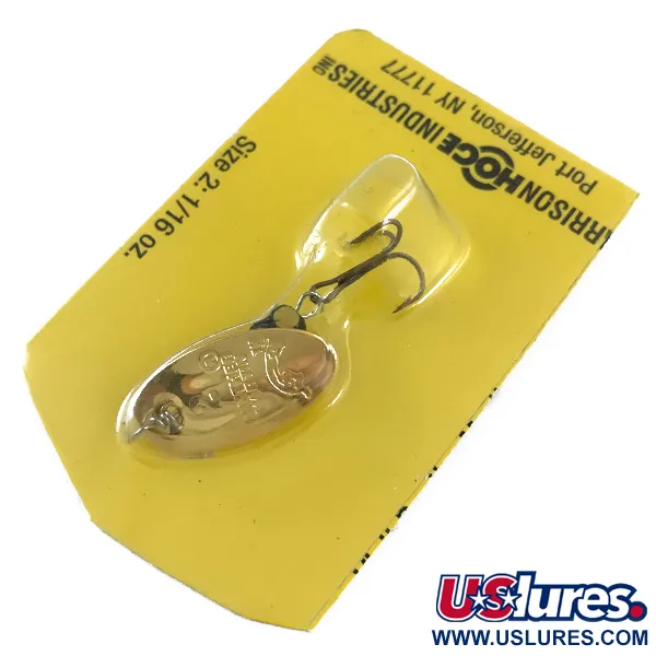Een vergulde laag bedekt zowel het druppelvormige lichaam als het unieke bol-holle blad van deze spinner maat 2. Met een gewicht van 3/32oz (2,5g) en een totale lengte van 1 1/2" (4cm), is dit exemplaar een schoolvoorbeeld van het in-line ontwerp dat populair werd gemaakt door Harrison Hoge Industries. Het blad is rechtstreeks op de as gemonteerd zonder beugel, waardoor het dicht bij het verzwaarde lichaam kan draaien. Dit kunstaas, productcode 5169, is ongebruikt in de originele gele blisterverpakking, die het adres in Port Jefferson, NY draagt en de Dominicaanse Republiek als land van herkomst vermeldt. Hoewel de voorzijde van de kaart 1/16 oz aangeeft, vermelden de specifieke catalogusgegevens voor deze eenheid 3/32oz (2,5g). De hardware bestaat uit een extreem scherpe dreg, en de achterkant van de kaart bevat het PantherMartin.com webadres samen met de wettelijk verplichte veiligheidswaarschuwingen.
