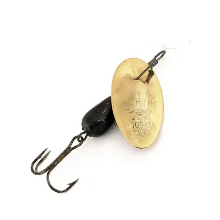Gstempeld met de herkomst "ITALY" en patentnummers op het bolle oppervlak, identificeert het gouden blad van deze spinner hem als een ware klassieker. Dit specifieke exemplaar, gecatalogiseerd onder code 12603, is voorzien van het kenmerkende druppelvormige gewicht in een diepzwarte afwerking. Met een lengte van 4 cm en een gewicht van 4 g is het een uitstekende keuze voor beekforel. De as-door-het-blad-constructie is een kenmerk van het Panther Martin-ontwerp, waardoor het gouden blad begint te draaien zodra het het water raakt. Met een score van 5/5 is de staat van dit kunstaas uitstekend, waarbij de dreg en het metalen oog geen tekenen van slijtage of ouderdom vertonen. De gepolijste vergulding biedt een scherp contrast met het donkere lichaam, specifiek ontworpen voor zichtbaarheid in verschillende waterhelderheden.