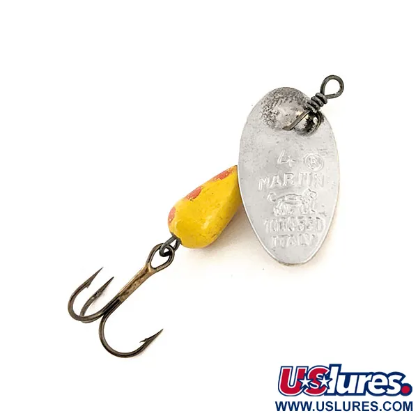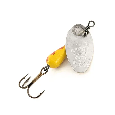 Op het zilveren blad van deze Panther Martin 4 staat duidelijk het merkteken van de Italiaanse oorsprong gestempeld, een detail dat zeer gewaardeerd wordt door verzamelaars van vroege Europese hengelsportartikelen. Het druppelvormige lichaam, met een gewicht van 4 g (1/8 oz), heeft een klassiek geel lakwerk met duidelijke rode stippen. De spinner heeft een lengte van 4 cm (1 1/2") en is uitgerust met een robuuste dreg en het iconische in-line blad dat direct door de metalen as gaat. Deze specifieke constructiemethode, waarbij het blad direct op de draad draait in plaats van aan een beugel, is het kenmerk van de ontwerpen van het merk uit het midden van de vorige eeuw. Met een score van 5/5 is dit exemplaar in uitstekende staat, waarbij de verf de originele helderheid heeft behouden en de metalen oppervlakken geen noemenswaardige aanslag vertonen. Op de voorzijde van het blad staat het springende panterlogo en de aanduiding "REG. U.S. PAT. OFF." in reliëf. De draadwikkeling bij het oogje is strak en recht gebleven, wat duidt op de originele fabrieksassemblage.