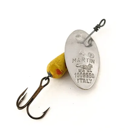 Geponst met het nummer 4 en het iconische leeuwenlogo, toont het zilveren blad van deze vintage spinner duidelijk zijn Italiaanse oorsprong. Het druppelvormige lichaam heeft een gele basis met rode stippen en vertoont lichte lakslijtage die getuigt van zijn tijd in de tacklebox. Dit Panther Martin-ontwerp monteert het blad direct op de as, waardoor een traditionele ruiter (clevis) overbodig is. Hij weegt 1/8 oz (4 g) en heeft een totale lengte van 1 1/2" (4 cm). Een donker geworden maar structureel gezonde dreg is aan de achterzijde bevestigd, en het kunstaas staat officieel geregistreerd onder productcode 13181. Gezien de solide staat en het schone metaal behoudt hij een conditiescore van 5/5.