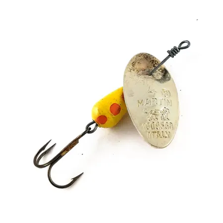 "Italy" staat duidelijk in de holle kant van het zilveren blad gestanst, wat deze Panther Martin 4 identificeert als een exemplaar uit de originele Europese productielijn. Met een gewicht van 4g (1/8 oz) en een totale lengte van 4cm (1 1/2"), maakt het kunstaas gebruik van een geel druppelvormig lichaam geaccentueerd met duidelijke rode stippen. Het blad, genummerd 1009368, is voorzien van de iconische L MARTIN naam en leeuwenstempel, cruciale details voor het verifiëren van authentieke vintage Italiaanse productie. Beoordeeld met een conditie van 5/5, blijft de afwerking glanzend en de hardware is vrij van de slijtage die vaak wordt aangetroffen op gebruikte spinners. Dit specifieke model, met productcode 13282, maakt gebruik van het klassieke shaft-through-blade ontwerp waarbij het zilveren blad direct op de as zit. Een met draad omwikkelde dreg maakt de constructie af, vastgezet met de strakke, gelijkmatige wikkelingen die kenmerkend zijn voor de assemblage van dit merk.