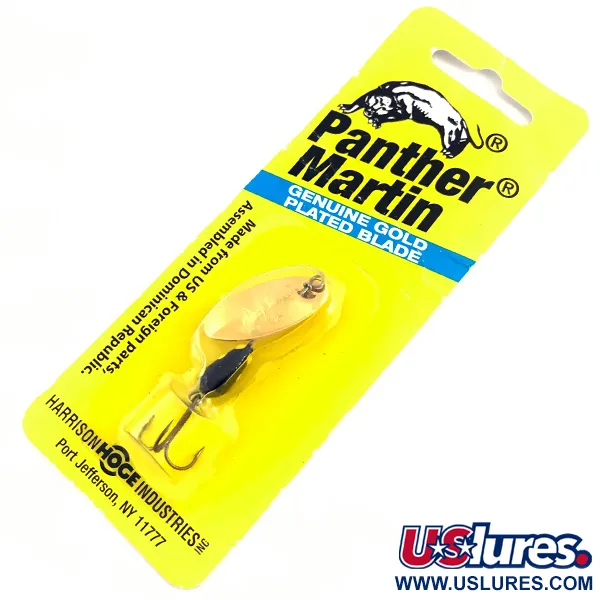 De echte goudlaag op het bolle blad kenmerkt deze 4 g (1/8 oz) spinner als een klassieke keuze voor forel in helder water. Dit specifieke exemplaar, herkenbaar aan productcode 4583, beschikt over het iconische bladontwerp gemonteerd op de as, een handelsmerk van de Panther Martin-lijn. Met een lengte van 4,5 cm (1 3/4") maakt het kunstaas gebruik van een druppelvormig zwart lichaam om het gewicht te concentreren. Het blad is direct op de draadas gemonteerd, een constructiedetail dat volgens de verpakking van Harrison-Hoge Industries zorgt voor sonische trillingen. Geassembleerd in de Dominicaanse Republiek, toont de gele kaart de modelaanduiding 4-PMR-G en een adres in Port Jefferson, NY. Het kunstaas is ongebruikt en zit nog in de originele blisterverpakking. De achterkant vermeldt technische kenmerken zoals het verzwaarde lichaam en vlijmscherpe haken.