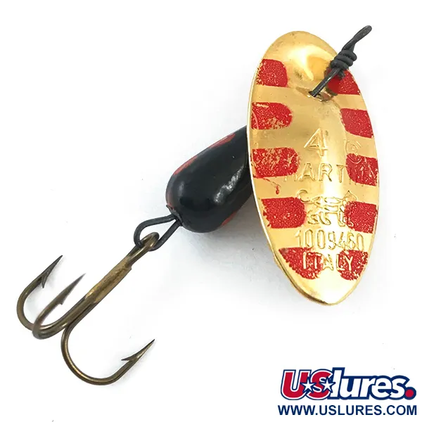 Gemerkt met 'ITALY' en de reeks '1009450', biedt het gouden blad van deze vintage spinner een duidelijk beeld van de Europese productiegeschiedenis van dit kunstaas. Deze Panther Martin 4, gecatalogiseerd onder productcode 4666, heeft een verguld blad met rode diagonale strepen gecombineerd met een zwarte druppelvormige body met oranjerode stippen. Met een lengte van 4 cm (1 1/2") en een gewicht van 4 g (1/8 oz), vertrouwt de constructie op het beroemde 'post-mount' systeem van het merk, waarbij het blad direct op de as draait om een uniek rotatieprofiel te creëren. Momenteel beoordeeld met een conditie van 4/5, behouden de metalen oppervlakken een hoge glans terwijl de verf op de verzwaarde body grotendeels intact is. De bronzen dreg is origineel en vertoont de typische afwerking van hardware uit het midden van de vorige eeuw. De druppelvormige body is ontworpen om stabiele binnenvisserij in verschillende stroomsnelheden te vergemakkelijken. Het getal '4' dat prominent op de voorzijde van het blad is gestempeld, identificeert dit als een veelzijdige maat voor lichte visserij op forel en baarsachtigen.