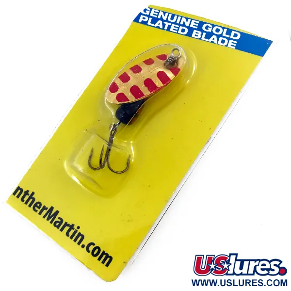 De vergulde afwerking op het blad van deze Panther Martin 4 zorgt voor een hoge mate van schittering, een kenmerkend element van deze 4 g (1/8 oz) spinner. Het blad is voorzien van een opvallend patroon van rode druppelvormige accenten over het echt vergulde oppervlak. Dit kunstaas van 4,5 cm (1 3/4"), herkenbaar aan productcode 4995, maakt gebruik van het kenmerkende inline-ontwerp waarbij de as direct door het blad gaat om rotatie mogelijk te maken. Het verzwaarde zwarte lichaam is gevormd om stabiele worpen en dieptecontrole te vergemakkelijken. Dit exemplaar is ongebruikt en verkeert in de staat waarin het de fabriek in de Dominicaanse Republiek verliet, met een conditiescore van 6. Het zit nog op de originele gele kaart van Harrison Hoge Industries, waarop de convex/concave bladarchitectuur en de scherpe dreggen worden beschreven. De verpakking bevat ook het webadres van de fabrikant en veiligheidswaarschuwingen met betrekking tot de loodcomponenten in het verzwaarde lichaam.