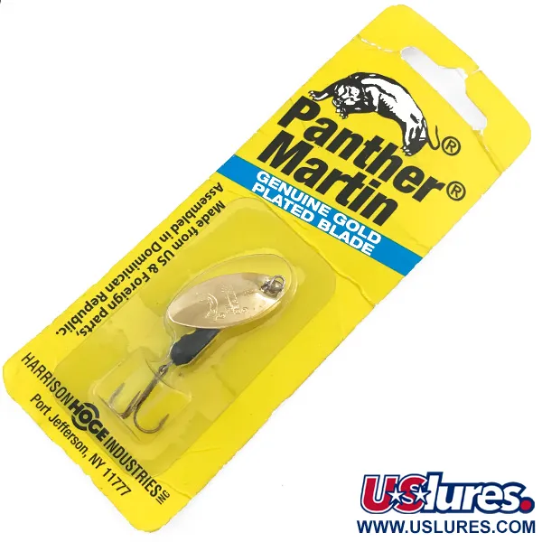Echt goud verguldt het unieke bol/holle blad van deze klassieke inline spinner. De Panther Martin 4-PMR-G weegt 4 g (1/8 oz) en heeft een verzwaarde zwarte body met opvallende gele stippen. De constructie benadrukt het kenmerkende blade-on-shaft ontwerp van het merk, dat is ontwikkeld om gemakkelijk te spinnen zonder een aparte beugel. Met een lengte van 4,5 cm (1 3/4") bevindt dit exemplaar zich in de originele gele blisterverpakking van Harrison Hoge Industries, wat bevestigt dat het ongebruikt is. Zoals vermeld op de kaart, is het geassembleerd in de Dominicaanse Republiek met een mix van Amerikaanse en buitenlandse componenten. De achterkant van de verpakking, voorzien van productcode 4-PMR-G, beschrijft de technische voordelen van het ontwerp, waarbij specifiek wordt vermeld hoe de bladvorm sonische trillingen uitzendt. Dit specifieke kunstaas, ook gecatalogiseerd als item 4997, is uitgerust met een fabrieksmatig scherpe dreg.