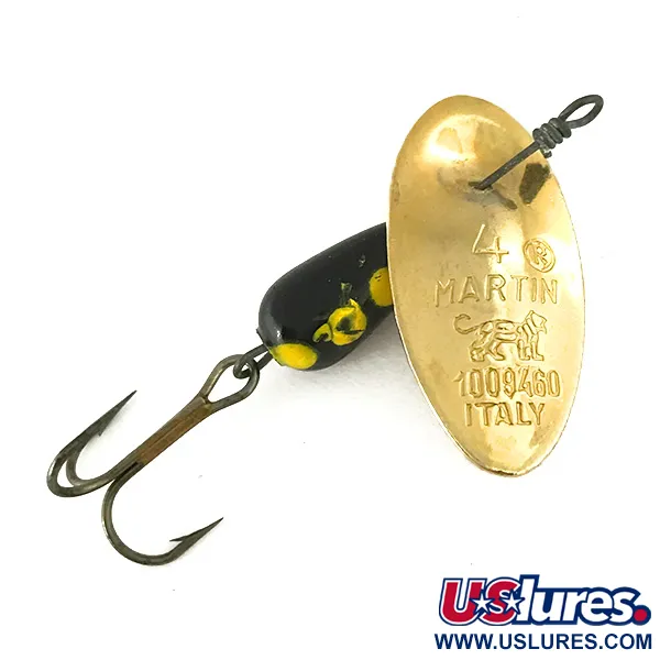 Met een gewicht van 4g (1/8oz) en een totale lengte van 4cm (1 1/2") vertegenwoordigt dit exemplaar het precieze vakmanschap van de vroege Italiaanse productie. Het bolle goudkleurige blad is diep gestempeld met maatnummer 4, de Panther Martin merknaam, het klassieke leeuwenlogo, patentnummer 1009460 en de Italiaanse herkomst. Het kenmerkende druppelvormige lichaam is afgewerkt met een contrastrijke zwarte verf met gele stippen, een patroon waar sportvissers van oudsher op vertrouwen in zowel helder als troebel water. Gebouwd met het blad direct op de as gemonteerd in plaats van aan een beugel, ontstaat een gestroomlijnd profiel dat direct begint te spinnen zodra het het water raakt. Deze specifieke spinner, productcode 7393, verkeert in uitstekende 5/5 staat, waarbij de lak op het loden lichaam en de metalen plating op het blad uitzonderlijke helderheid vertonen. De vlijmscherpe, gebronsde dreg is stevig bevestigd aan de zware draadas.