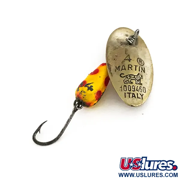 Duidelijk in het mat messing blad gestanst is het iconische leeuwenlogo naast het patentnummer 1009460, wat de authentieke Italiaanse herkomst bevestigt. Met een gewicht van 1/8 oz (4 g) is deze spinner een precisie-instrument voor de jacht op forel in klein water. Het druppelvormige lichaam heeft een heldergele afwerking met duidelijke rode stippen, een kleurencombinatie die al decennia lang succesvol is in talloze riviersystemen. Omdat het blad direct op de as is gemonteerd zonder beugel, begint het direct te draaien bij het binnendraaien. Deze Panther Martin 4, geregistreerd onder productcode 7512, heeft een compacte lengte van 4 cm (1 1/2") en vertegenwoordigt het productietijdperk dat verzamelaars prijzen om het vakmanschap. De spinner is voorzien van een enkele haak met weerhaak, wat een traditioneel en minder vastlopergevoelig profiel biedt voor rotsachtige beekbodems. Ondanks lichte slijtage aan het oppervlak door eerder gebruik behoudt het kunstaas zijn originele charme; de conditie is een respectabele 4/5.