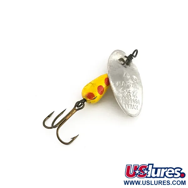 Op het zilveren metalen blad staat duidelijk het herkomstmerk uit Italië gestempeld, een kenmerkend detail voor vroege Panther Martin spinners. Dit specifieke kunstaas, geïdentificeerd met productcode 8294, heeft het klassieke gele druppelvormige lichaam versierd met drie opvallende rode stippen. Het exemplaar weegt 1/8oz (4g) en is 1 1/2" (4cm) lang. Dit type kenmerkt zich door het unieke in-line blad, waarbij het concave zilveren blad direct op de as zit zonder beugel. De koperkleurige hardware en de originele dreg zijn uitzonderlijk goed bewaard gebleven. Op basis van de levendige verf en de glanzende metalen oppervlakken is de conditie van deze spinner 5/5. Deze Italiaanse importproducten lagen aan de basis van het succes van het merk in de Noord-Amerikaanse forellenbeken in het midden van de 20e eeuw, geprezen om hun eenvoudige mechanische betrouwbaarheid.