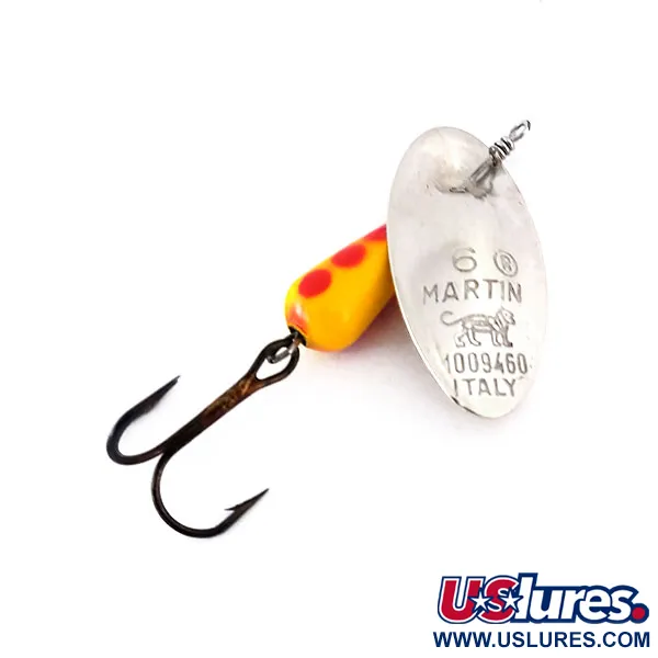 Op het nikkelen blad staat duidelijk het stempel 'ITALY', een kenmerk van deze vroege in Europa gemaakte spinners. Deze Panther Martin 6 weegt 3/16 oz (6 g) en beschikt over de iconische 'shaft-through-blade' constructie die hem onderscheidt van traditionele spinners met een beugeltje. Het blad zelf is voorzien van een vintage leeuwenlogo en het patentnummer 1009460, wat de historische oorsprong documenteert. Met een totale lengte van 2 1/4" (5,5 cm) is de kunstvlieg gebouwd rond een felgeel druppelvormig lichaam versierd met duidelijke rode stippen. De nikkelen afwerking op het blad is nog steeds helder, terwijl de achterkant een schone dreg heeft met de originele donkere coating. Beoordeeld met een conditie van 5/5, is het ijzerwerk recht en de verf op het lichaam opmerkelijk strak. Omdat het blad direct op de as is gemonteerd, biedt het een kenmerkend rotatieprofiel dat dit model al decennia lang tot een favoriet voor forelvissers maakt. Dit exemplaar, vermeld onder productcode 10141, toont het nauwkeurige vakmanschap uit het Italiaanse productietijdperk van het merk.