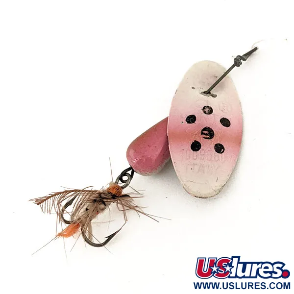 Vijf gedurfde zwarte stippen vallen op tegen het wit-roze verloop van het blad, een kenmerkende look voor deze in Italië gemaakte klassieker. Met een gewicht van 6 g (3/16 oz) meet deze Panther Martin 6 precies 5 cm (2 in) en is voorzien van productcode 12601. Het druppelvormige lichaam is uitgevoerd in een bijpassende roze tint en eindigt in een gedresseerde dreg, gebonden met subtiele bruine en oranje vezels. Doordat het blad direct op de metalen as is gemonteerd, behoudt het een zeer compact profiel in vergelijking met traditionele spinners met een beugel. Dit specifieke exemplaar verkeert in 5/5 conditie, waarbij de 'ITALY' stempel op de achterzijde van het blad scherp en goed leesbaar is gebleven. De zachte roze vervaging op de bovenste helft van het blad zorgt voor een mooi contrast met de witte basis. Het ijzerdraad is strak gevormd en al het beslag vertoont geen tekenen van ouderdom of slijtage, waardoor de originele fabrieksglans behouden is gebleven.