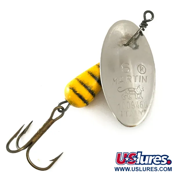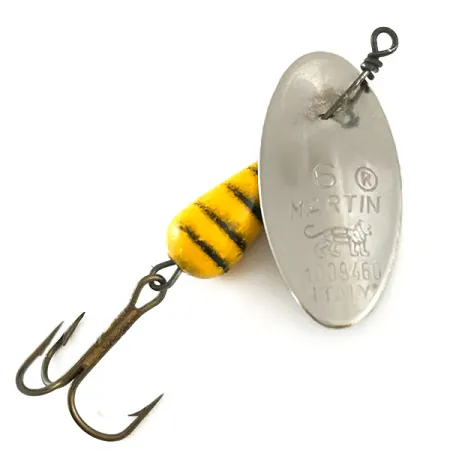 Duidelijk in het nikkelen blad gestanst, bevestigen het "6 MARTIN" merkteken en het klassieke leeuwenlogo de authentieke Italiaanse herkomst. Dit specifieke exemplaar, gecatalogiseerd onder productcode 6329, heeft het kenmerkende druppelvormige lichaam, uitgevoerd in levendig geel met duidelijke zwarte horizontale strepen. Met een score van 5/5 verkeert het kunstaas in uitzonderlijke staat, waarbij de originele fabrieksafwerking op zowel het verzwaarde lichaam als het gepolijste nikkelen blad behouden is gebleven. Met een gewicht van 6g (3/16oz) en een lengte van 5cm (2"), maakt het ontwerp gebruik van een in-line spinnerconfiguratie waarbij het blad direct op de metalen as is gemonteerd zonder beugel. De achterzijde van het blad vermeldt patentnummer 1039460 en is diep gegraveerd met "ITALY", wat de productieperiode van deze vroege importmodellen weerspiegelt. Een donkere, scherpe dreg aan de achterzijde maakt dit klassieke kunstaas compleet, ideaal voor precisieworpen in forellenbeken of lichte zoetwatertoepassingen.