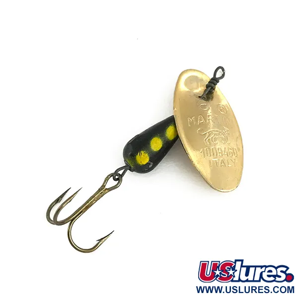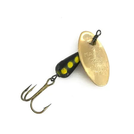 Op het bolle oppervlak van het goudkleurige blad is de iconische naam Panther Martin duidelijk gestempeld, samen met de herkomstmarkering Italië. Deze specifieke spinner, herkenbaar aan productcode 7289, heeft het klassieke druppelvormige lichaam, uitgevoerd in diepzwart met kenmerkende gele stippen. Met een gewicht van 6 g (3/16 oz) heeft het kunstaas een totale lengte van 5 cm (2") inclusief de dreg. De unieke constructie zorgt ervoor dat het blad direct op de as draait in plaats van op een beugel, een ontwerpkeuze waarmee het merk zich onderscheidt in de wereld van inline spinners. Dit exemplaar is ongebruikt en heeft nog de heldere fabriekskleuren en gladde metalen oppervlakken. De messingkleurige onderdelen en de scherpe bocht van de haken duiden op een goed bewaard gebleven stuk Italiaans vakmanschap.