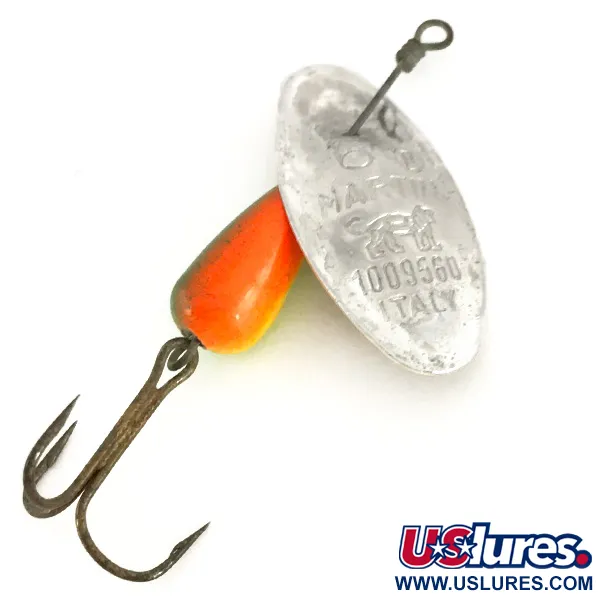 Duidelijk gestempeld op de bolle zijde van het zilveren blad is de herkomst „ITALY” en het patentnummer 1009560, wat deze Panther Martin 6 kenmerkt als een authentiek deel van de Europese hengelsportgeschiedenis. Met een gewicht van 6 g en een lengte van 5 cm is dit exemplaar voorzien van de klassieke druppelvormige body, afgewerkt in een levendig rood en oranje verloop over een groene basis. Dit specifieke ontwerp maakt gebruik van een blad dat direct op de as is gemonteerd, wat zorgt voor een ruimere rotatie en duidelijke trillingen veroorzaakt tijdens het binnenvissen. Het beslag bestaat uit een stevige dreg die lichte ouderdomssporen vertoont, maar solide blijft voor display of gebruik. Met een conditiescore van 4/5 ziet het kunstaas er goed uit met minimale slijtage die het vintage karakter onderstreept. Het zilveren blad is voorzien van het kenmerkende logo van de springende kat, wat het identificeert als onderdeel van de 7707-serie. De verzwaarde body is ontworpen om de massa gelijkmatig te verdelen voor verdere en nauwkeurigere worpen in krappe plekken.