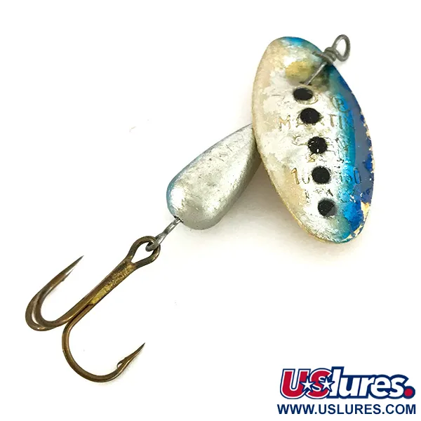 Een klassiek druppelvormig loden lichaam helpt deze vintage spinner efficiënt te werpen terwijl de balans behouden blijft. Met een gewicht van 3/16 oz (6 g) en een totale lengte van 2" (5 cm), behoort dit exemplaar tot de iconische serie die bekend staat om zijn unieke blad-op-as ontwerp waarbij de as direct door het metaal gaat. Het bolle blad is afgewerkt in een zilveren en blauwe gradiënt met opvallende zwarte stippen, een kleurenschema dat opvalt tussen de meer gebruikelijke gouden of gele patronen. Duidelijk gestempeld met het merkteken van de maker, draait het blad rond een goudkleurige kraal-afstandhouder die vastlopen tegen het verzwaarde lichaam voorkomt. Deze specifieke Panther Martin 6, geïdentificeerd door productcode 7708, is voorzien van een bronzen dreg die stevig bevestigd blijft. De conditie is beoordeeld als 4/5, vertoont lichte gebruikssporen van eerdere vistrips maar behoudt al zijn originele structurele karakter.