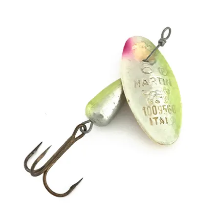 In het metaal van het zilveren blad staat duidelijk het 'ITALY'-merk geslagen, een bewijs van het Europese vakmanschap van deze vintage Panther Martin 6. Met een gewicht van 6 g (3/16 oz) en een lengte van 5,5 cm (2 1/4") heeft deze inline spinner een specifiek kleurpatroon dat een zilveren basis combineert met een chartreuse-glans en een duidelijk roze accent op de punt. Het druppelvormige lichaam, ontworpen voor een optimale gewichtsverdeling tijdens het werpen, is afgewerkt in bijpassende chartreuse- en zilvertinten. Een opvallend technisch kenmerk van dit model, geïdentificeerd door productcode 8537, is dat het blad direct op de as is gemonteerd in plaats van op een beugel, wat zorgt voor een vaste rotatieas rond de centrale draad. De hardware bevat een dreg met een donkere afwerking. Dit exemplaar is in 5/5 conditie, met behoud van de originele lak en scherpe stempels, inclusief het identificatienummer 1009560 op het blad.