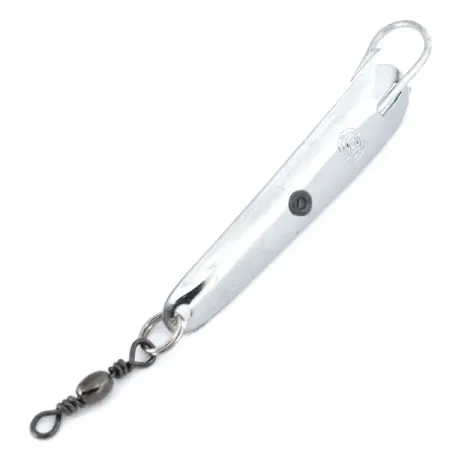 Deze slanke lepel met een Nickel-afwerking komt uit Italië en is precies 6cm (2 1/4") lang. De Panther Martin Cheppia con Amo is een gespecialiseerd metalen kunstaas met een kenmerkend ontwerp met een enkele haak, waarbij de haak direct aan het gepolijste lichaam is bevestigd. Dit specifieke exemplaar, gecatalogiseerd onder productcode 10874, is in ongebruikte staat. Met 5,5g (3/16oz) is het gewicht geconcentreerd voor het werpen of een verticale presentatie. Een klein zwart cirkelvormig element is in het midden van het lichaam geplaatst en zorgt voor een subtiel contrast met het hoogglanzende oppervlak. Het bevestigingsoog is uitgerust met een stevige splitring en een zwartgeblakerde tonwartel om het kinken van de lijn tijdens het binnenvissen te verminderen. Het iconische Panther Martin-logo is strak in de nikkelen laag gestampt bij de haak.