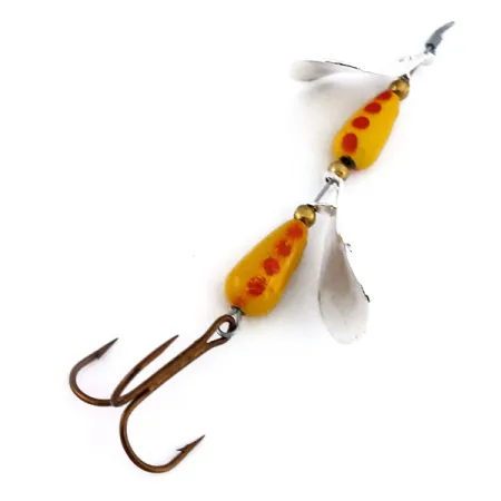 Twee gestanste nikkelen bladen, maat 3 en 4, bepalen het profiel van deze vintage Europese tandemspinner. Elk blad is gekoppeld aan een kenmerkend druppelvormig lichaam, afgewerkt met een heldergele basislaag en geaccentueerd met vier opvallende rode stippen. Dit specifieke exemplaar, gecatalogiseerd onder productcode 10868, werd vervaardigd in Italië en vertegenwoordigt een minder gebruikelijke tandemconfiguratie voor het Panther Martin-assortiment. De constructie bestaat uit een enkel draadframe waarbij de bladen direct op de as draaien, leidend naar een scherpe, bronskleurige dreg. Dit kunstaas is in ongebruikte staat en heeft de originele fabrieksafwerking en glans behouden op zowel de verf als de metalen onderdelen. Met een gewicht van 1/2 oz (14 g) en een totale lengte van 3 1/2" (9 cm), biedt het een aanzienlijk profiel voor het vissen op grotere forel of baars in dieper water. De vernikkelde bladen zijn aan de bolle zijde duidelijk voorzien van de naam "MINKEN" en de respectievelijke maataanduidingen.