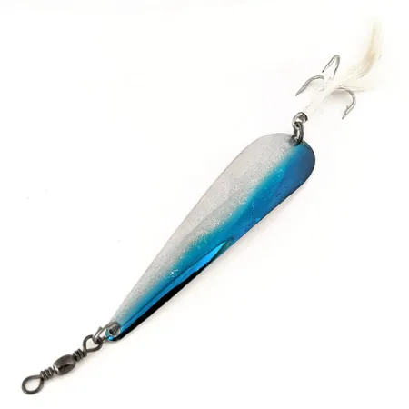 Een slank profiel van 11 cm kenmerkt de Panther Martin Sarda “Como” con Penna, een lepel die zorgvuldig in Italië is geproduceerd. De afwerking van dit kunstaas van 18 g is verdeeld in een levendig blauw gedeelte en een zijde van getextureerd nikkel die een duidelijk visueel contrast vormt met de gladde, gepolijste nikkelen achterkant. Een witte vederdressing is aan de dreg bevestigd, wat een zacht element toevoeget aan de metalen body. Dit exemplaar, met productcode 12559, is ongebruikt en verkeert in originele fabrieksstaat, met schone oppervlakken op zowel het beslag als de body. Het is uitgerust met een zwarte tonwartel aan de voorste splitring, een standaardkenmerk voor dit model om de montage voor werpen of trollen te vergemakkelijken. Het vakmanschap weerspiegelt de klassieke Italiaanse productie die geassocieerd wordt met de Sarda-serie.