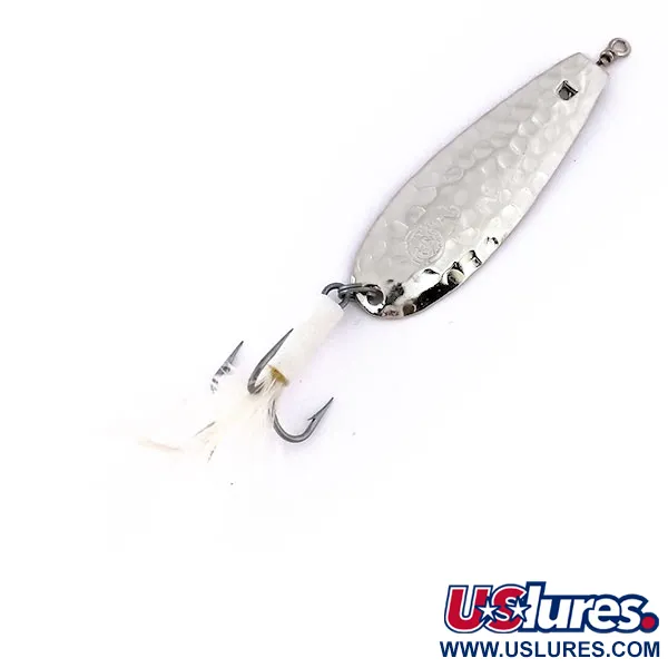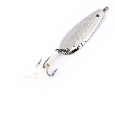Gehamerde nikkelafwerkingen sieren het reflecterende oppervlak van deze in Italië vervaardigde spinner, een ontwerpkeuze die bedoeld is om de schittering tijdens het werpen of trollen te maximaliseren. Met een gewicht van 5,5 g (3/16 oz) en een lengte van 5,5 cm (2 1/4") is deze Panther Martin Svizzero Martellato con penna ongebruikt. Dit kunstaas, gecatalogiseerd onder productcode 10255, is voorzien van een witte gevederde dreg die een zacht, natuurlijk visueel profiel toevoegt. De constructie van Italiaanse makelij bevat een robuuste wartel aan de bovenzijde om kinken in de lijn te minimaliseren. Elke inkeping in het metaal is nauwkeurig aangebracht en de witte versiering op de haak is schoon en goed bewaard gebleven.