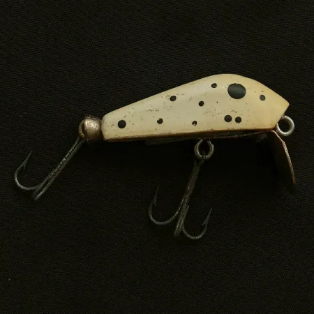 Op de metalen duiklip staat het merkteken van de fabrikant duidelijk ingeslagen, wat deze Amerikaanse zeldzaamheid identificeert als de Paul Bunyan Dyna-mite onder productcode 23512. Met een lengte van slechts 4,5 cm heeft de plug een compact, druppelvormig lichaam dat is ontworpen voor gericht werpen. De crèmekleurige afwerking is versierd met zwarte stippen, waaronder een opvallende stip aan de achterkant, een ontwerp dat typerend is voor Amerikaans vismateriaal uit het midden van de vorige eeuw. Er zijn twee scherpe dreggen gemonteerd – één aan de buik en één aan de staart – met robuust bevestigingsmateriaal. Met een gewicht van 11 gram heeft de plug een gewichtsverdeling die nauwkeurig werpen naar obstakels mogelijk maakt. De staat van dit specifieke exemplaar is 4/5, aangezien de originele lak en de kenmerkende stempel op de ronde duiklip goed leesbaar en bewaard zijn gebleven.