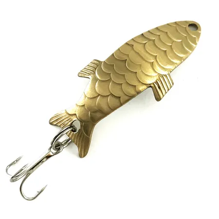Deze lepel van 7 g (1/4 oz) met een gedetailleerd schubbenpatroon op het messing lichaam is een klassiek voorbeeld van Amerikaans sportvismateriaal uit het midden van de vorige eeuw. Verzamelaars zullen dit model herkennen als de Pee Bee, een kunstaas geproduceerd in de VS door Al's Goldfish dat sinds de jaren 70 uit productie is. Het exemplaar, gecatalogiseerd onder productcode 6185, meet precies 5 cm (2") en toont het kenmerkende vissilhouet en de vindetails die typerend zijn voor de vintage lijn van het merk. Aan de achterzijde zijn de merk- en modelnaam duidelijk in het metaal geslagen, wat de authenticiteit als een echte zeldzaamheid bevestigt. Dit specifieke item verkeert in 5/5 conditie en heeft een schoon, uniform uiterlijk op de metalen oppervlakken. De hardware is voorzien van een stevige splitring met een scherpe dreg, bedoeld voor het werpen met licht materiaal. Elke schub aan de bolle kant is scherp gedefinieerd, wat de kwaliteit benadrukt van de originele stempels die decennia geleden werden gebruikt.